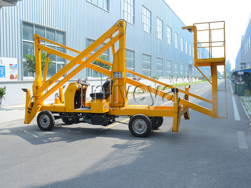 一种利用汽车引擎动力驱动的折臂式高空作业车。车辆的行走功能,使升降平台有更好的灵活性和机动性,使高空作业效率更高。折臂结构紧凑,采用新型优质型钢,强度高,重量轻,架设速度快,工作台既可升高又可水平延伸,还可旋转360度,易于跨越障碍到达工作位置。